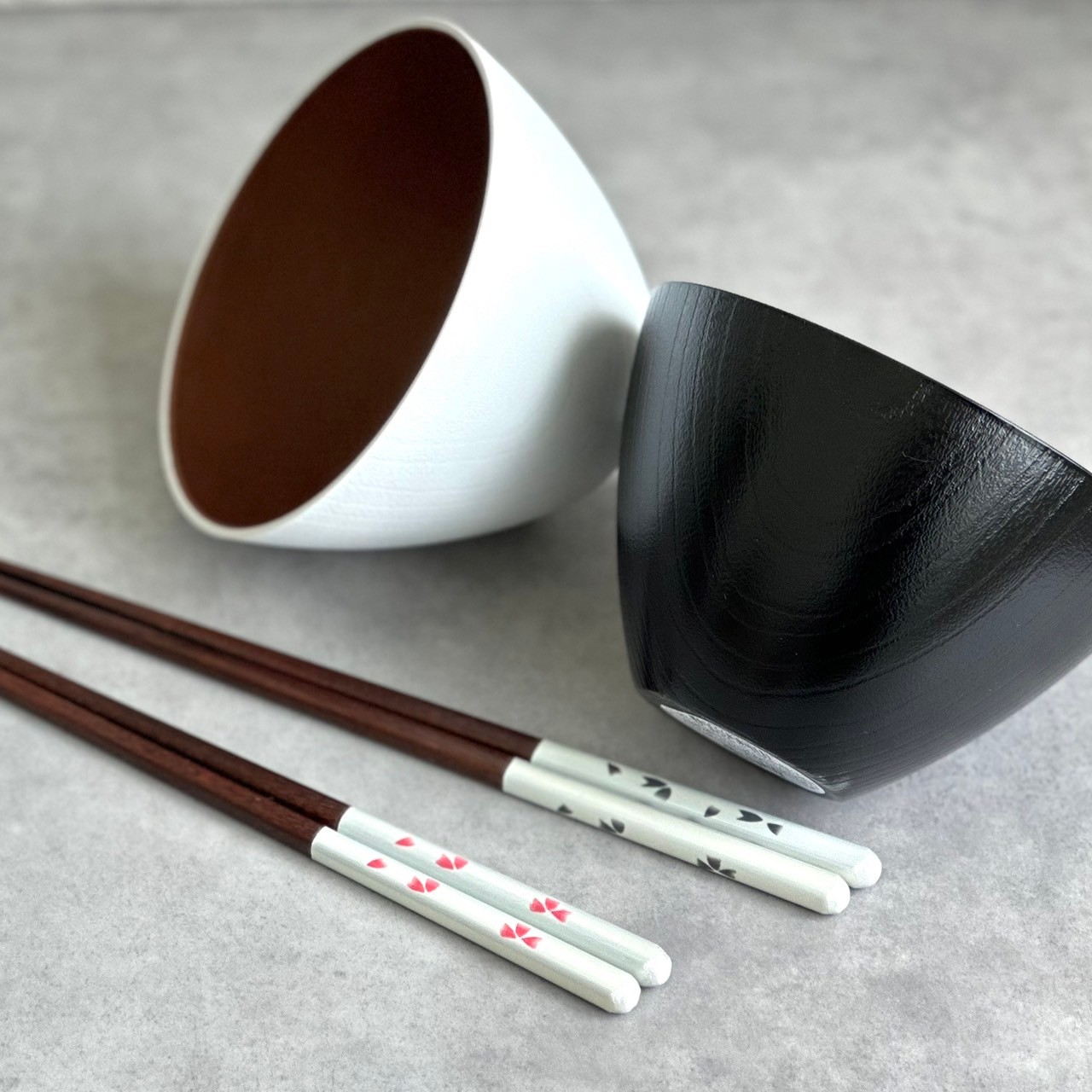 | ギフトボックス付き 紀州塗りモノクロマルチボウル ブラック ホワイト 2個セット 箸付き |